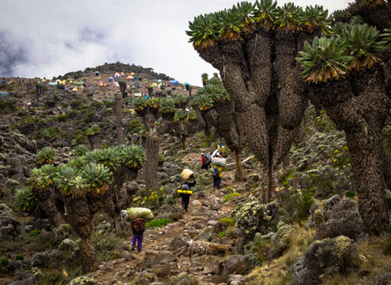 We begin with an exhilarating scramble up the famous Barranco Wall, a non-technical climb that rewards us with breathtaking views of the glaciers. The trail then rolls across a series of hills and valleys before reaching our camp at Karanga.